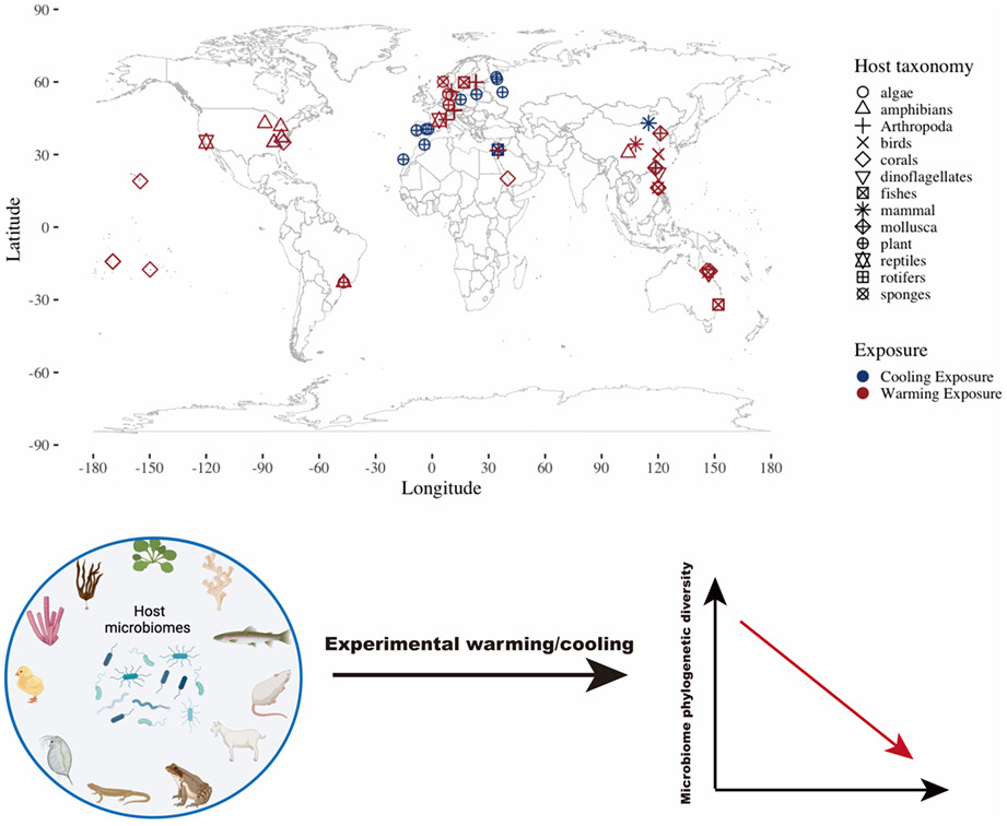Microbial symbiosis is ubiquitous in nature, spanning the mutualism-to-parasitism continuum. Global climate change has led to more extreme thermal events. The extent to which non-pathogenic microbiome communities change in response to warming or cooling may be important for predicting host performance under global change (Li et al., 2025). Using a meta-analysis of 1377 microbiomes from 43 terrestrial and aquatic species, we found a decrease in the amplicon sequence variant-level microbiome phylogenetic diversity and alteration of microbiome composition under both experimental warming and cooling. We showed that the host habitat and experimental factors affected microbiome diversity and composition more than host biological traits (Li et al., 2023).