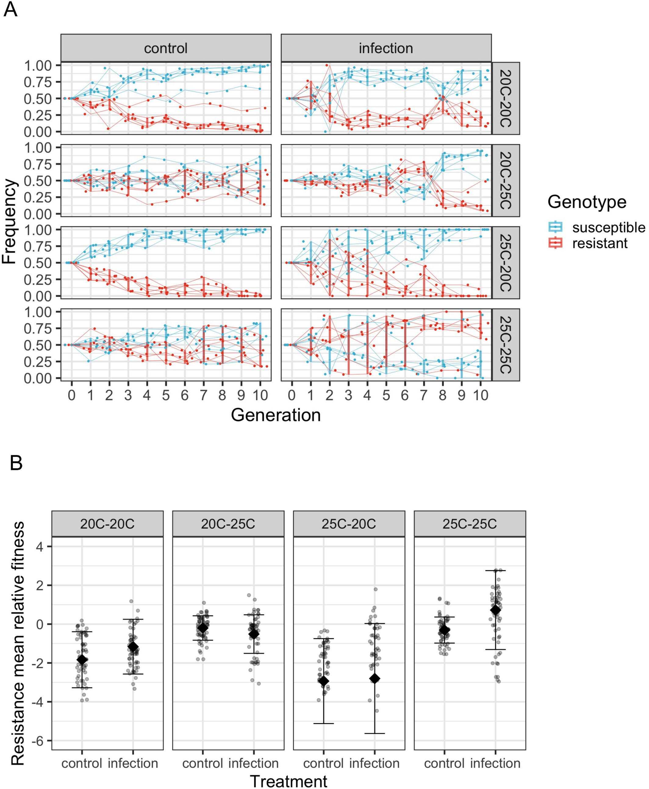 Climate change is increasing extreme heating events which may potentially exacerbate infectious diseases. Whether hosts can adapt to infection with rising temperatures is important for forecasting species persistence. We tested whether warming—at different host life stages—affects the ecological and evolutionary dynamics of resistance in Caenorhabditis elegans infected by a wild bacterial pathogen. We competed resistant and susceptible genotypes across 10 passages and tracked the spread of resistance in the population. Infection and prolonged warming strongly selected for the resistant genotype. Warming during host development induced plastic defences against infection, reducing the selective pressure for costly genetic-based resistance. Resistance was lost under ambient temperatures and periodic warming. Selection for resistance was likely weakened at ambient temperatures by the dilution effect, whereby the resistant genotype reduced pathogen transmission. Evolutionary dynamics of resistance depend on the balance among pathogen virulence, costs of genetic-based resistance, the dilution effect and plastic defences induced by temperature stress (Li et al., 2025).